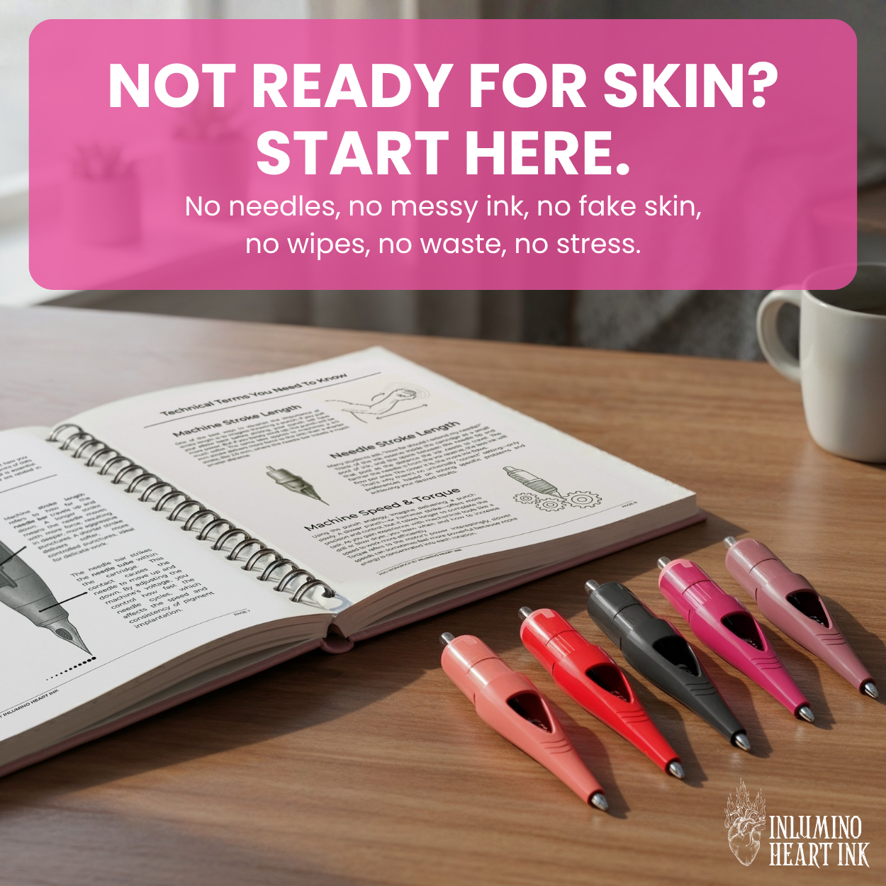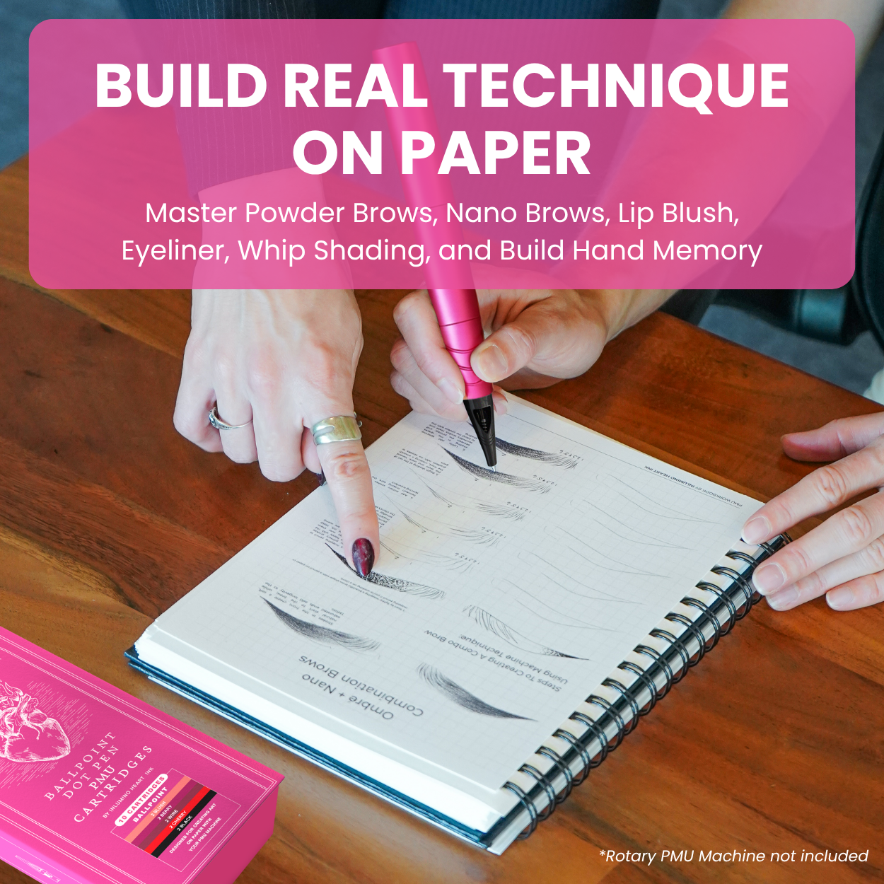 Most PMU practice requires fake skin, needles, and ink, which can be messy, costly, and inconvenient. Our PMU Edition Ballpoint Cartridges let artists train directly on paper with their own machines—no cleanup, no waste.